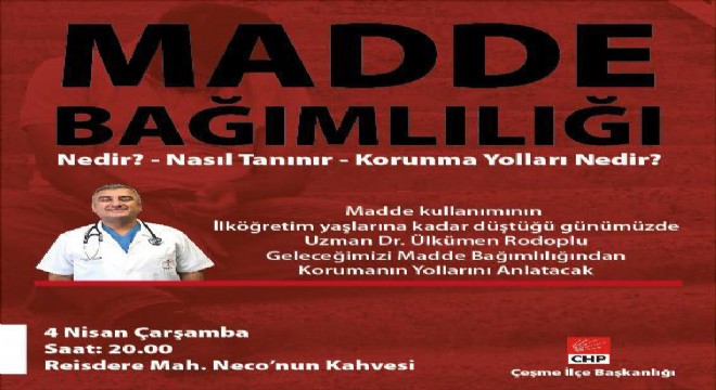 CHP Çeşme İlçe Başkanlığı, "Madde bağımlılığı" sorununa dikkat çekmek ve ailelere uyarılarda bulunmak üzere bir söyleşi düzenleyecek.