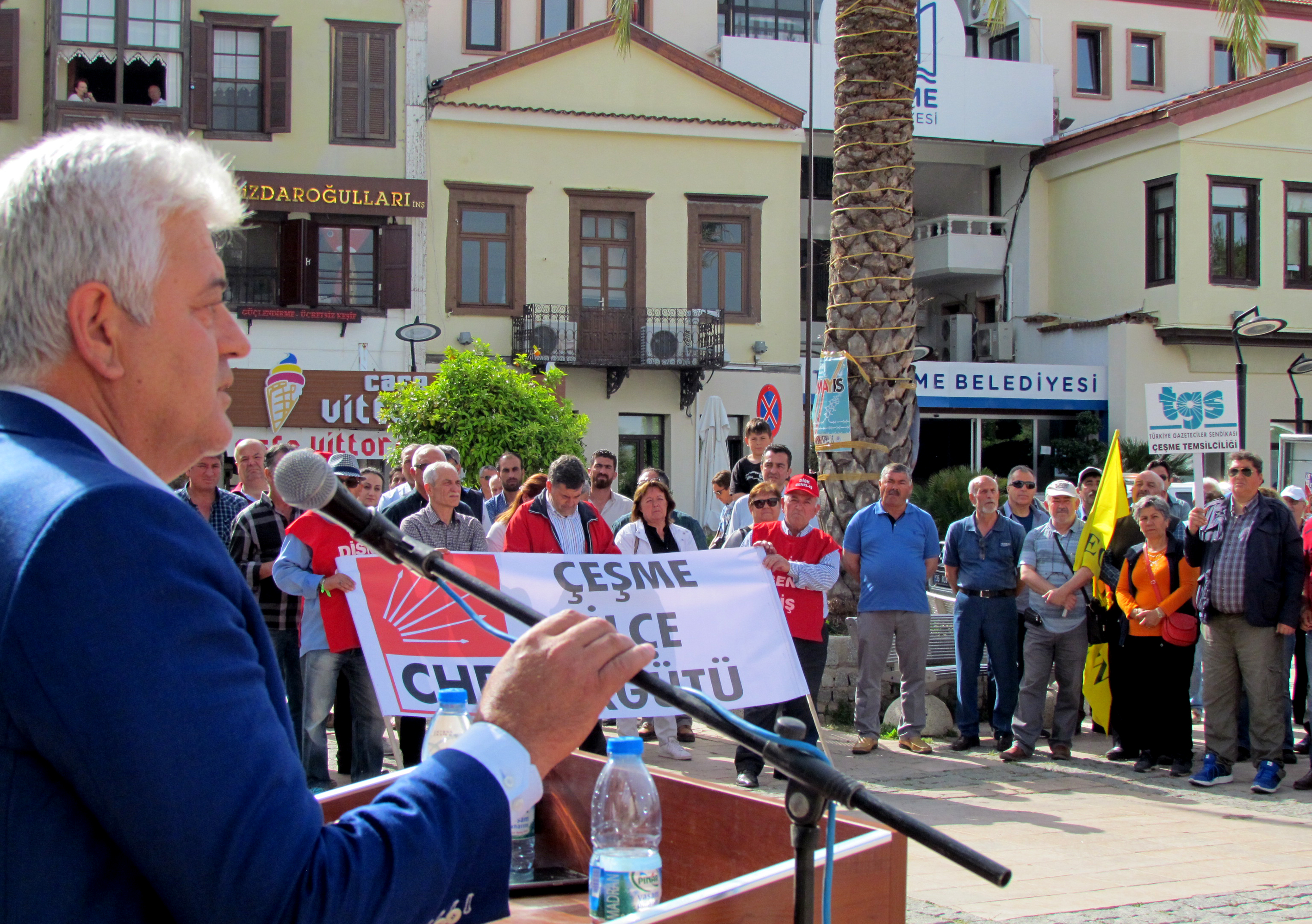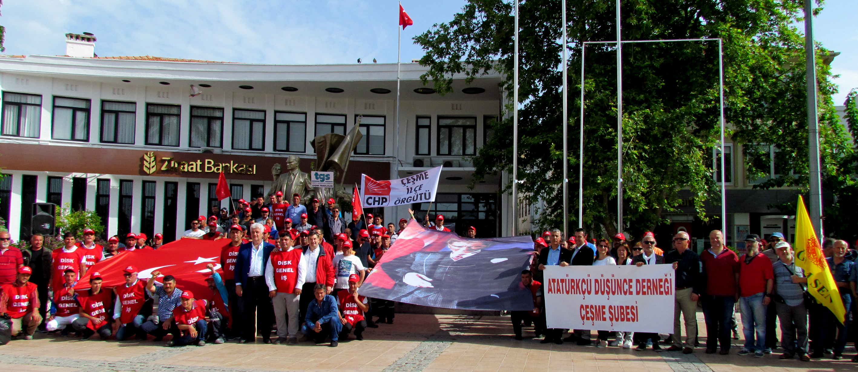 Çeşme çarşısında, sloganlar atarak gerçekleştirilen yürüyüş, Cumhuriyet Meydanı'nda sona erdi. Cumhuriyet Meydanı'nda, saygı duruşu ve İstiklal Marşı'nın okunarak göndere bayrak çekilmesinin ardından bir konuşma yapan Çeşme Belediye Başkanı Muhittin Dalgıç, emekçilerin sorunlarının çokluğuna dikkat çekerek, "Ama her şeyden önce sendikalaşma, örgütlülük yapısını içimize sindirmemiz gerekir. Uzun bir süredir, ülkemizde güdülen politikalarla birlikte, örgütlülük gittikçe dağıtılmaya çalışılıyor. Sonuçta sendikacılığı, sadece ücret politikaları üzerine çevirmiş bulunuyoruz. Her şeyden önce, insan olduğumuzu unutmamamız gerekir. Uzun bir süredir, bu meydanlarda, taşeronluktan, işçinin sömürülmesinden söz ediyoruz. Evet, maalesef... Ama taşeronluk yasası çıkarken bunun mücadelesinin verilmesi gerekirdi. Şimdi haklarınızı geri almak için uğraşıyoruz. Ama almanız çok zor. Gerçekten alamazsınız. İçinde bulunduğumuz ortamda, taşeron işçiliğin kaldırılması, bana göre, köleliğin kaldırılması çok kolay değil. Sendikal hareket, örgütlülük, bu ülkede çok kolay kazanılmadı. Bu kazanılan hakları, Çeşme meydanında toplanarak, 500-600 işçimizle geri alabilmek çok kolay değil. Taşeron işçiliğin kaldırılması talebini haykırmanız gerekir. Örgütlülüğümüzü devam ettirmek zorundayız. Bizler Belediye olarak, Belediye Başkanı olarak, Çeşme halkının verdiği yetkiye dayanarak, ücretlerle, sosyal haklarla, sendikalaşmayla ilgili önünüzü açmaya çalışıyoruz. Ama bu yeterli değil. Sivil toplum örgütleri ile birlikte öyle bir tek ses olmalıyız ki, bütün taleplerimizi ifade ederken sesimiz gür çıkabilmeli" diye konuştu.