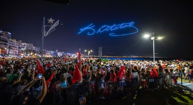 zmir Büyükşehir Belediyesi, 30 Ağustos Zafer Bayramı kutlamaları kapsamında Gündoğdu Meydanı’nda dron gösterisi yaptı. İzmir Körfezi’nin eşsiz manzarası, 500 dronun görsel şöleni ile unutulmayacak anlara sahne oldu. İzmirli yurttaşların gösteriyi en iyi açıdan izleyebilmesi için Alsancak İskelesi’ne platform kuruldu. Çok sayıda İzmirli, ünlü oyuncu ve sunucu Yavuz Seçkin’in sunuculuğunda 30 Ağustos’u kutladı, hep bir ağızdan marşlar söyledi.