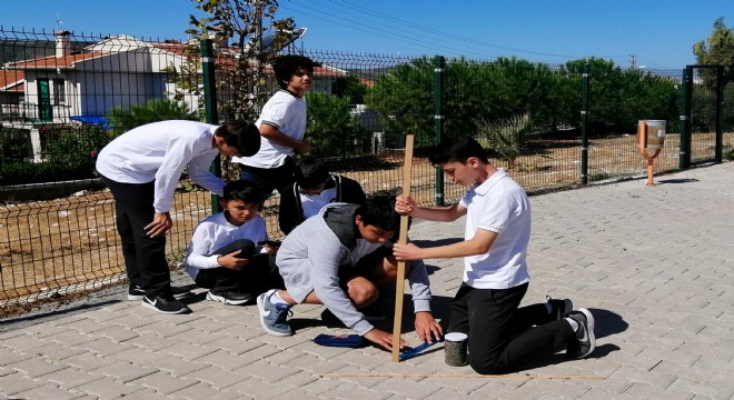 Çeşme'nin Alaçatı Mahallesi'ndeki İsmail Güral Ortaokulu öğrencileri, Fen Bilimleri öğretmenleri ile birlikte, Alaçatı'dan dünyanın çevresini ölçtüler.