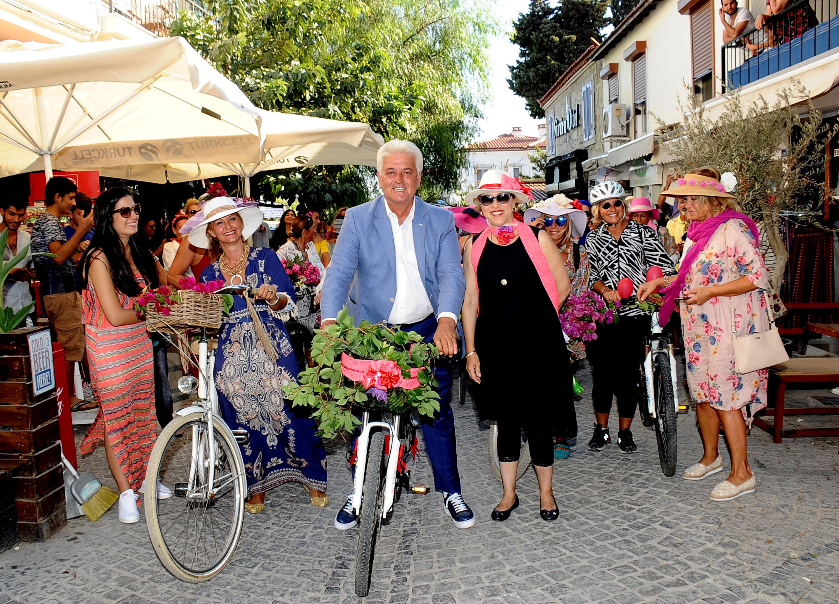 Süslü kadınların bisiklet turuna, Çeşme Belediye Başkanı Muhittin Dalgıç da kısa bir süre bisiklet sürerek eşlik etti.