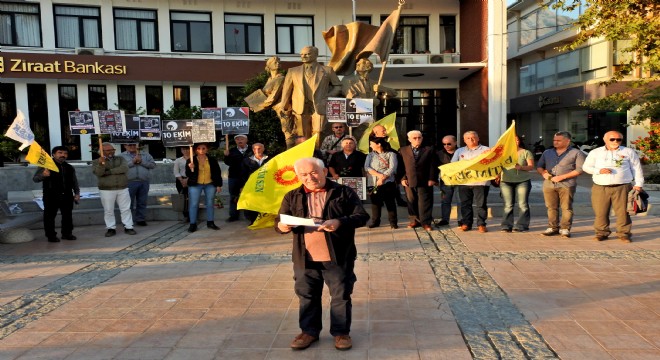 Cumhuriyet Meydanı'ndaki Atatürk Anıtı önünde, Eğitim-Sen Çeşme Ttemsilciliği Başkanı Hasan Karakaya tarafından yapılan basın açıklamasına, Eğit Der MYK Üyesi Nihat Kızılok, Çeşme Kent Konseyi Mahalle ve Muhtarlar Meclisi Başkanı Rasim Özgül, BES Çeşme Temsilciliği, Pir Sultan Abdal Kültür Derneği Çeşme Şubesi, ADD Çeşme Şubesi temsilcileri ve vatandaşlar katıldı.