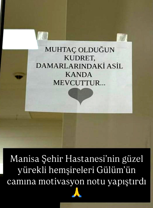 ŞŞehzadeler Belediyesi Gülşah Durbay’ın yakın arkadaşı olan Çeşme Belediye Başkanı Lal Denizli, sosyal medya hesabından duygusal paylaşım yaparak, yoğun bakım odasının camına hemşireler tarafından asılan bu yazının görselini paylaşarak, “Manisa Şehir Hastanesi’nin güzel yürekli hemşireleri Gülüm’ün camına motivasyon notu yapıştırdı” ifadesini kullandı.
