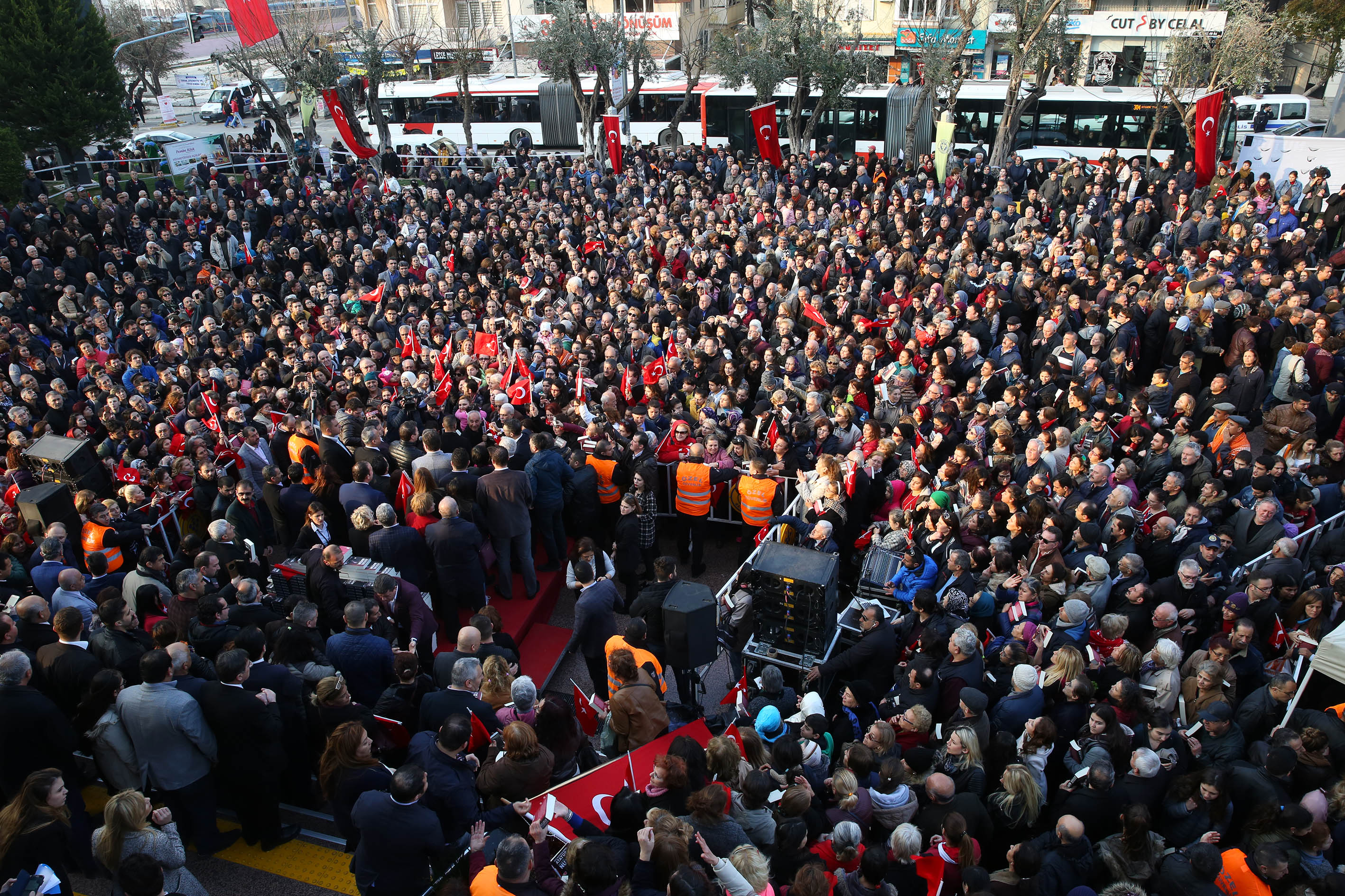 Marşlar ve Türk bayraklarıyla coşan binlerce Bucalı, Türkiye Cumhuriyeti’nin kuruluş tarihi Nutuk’u başlarının üzerinde taşıyıp ilginç görüntüler oluşturdu. Genci yaşlısı, kadını erkeğiyle Belediye önünü dolduran vatandaşların coşkusu uzun saatler sürdü.