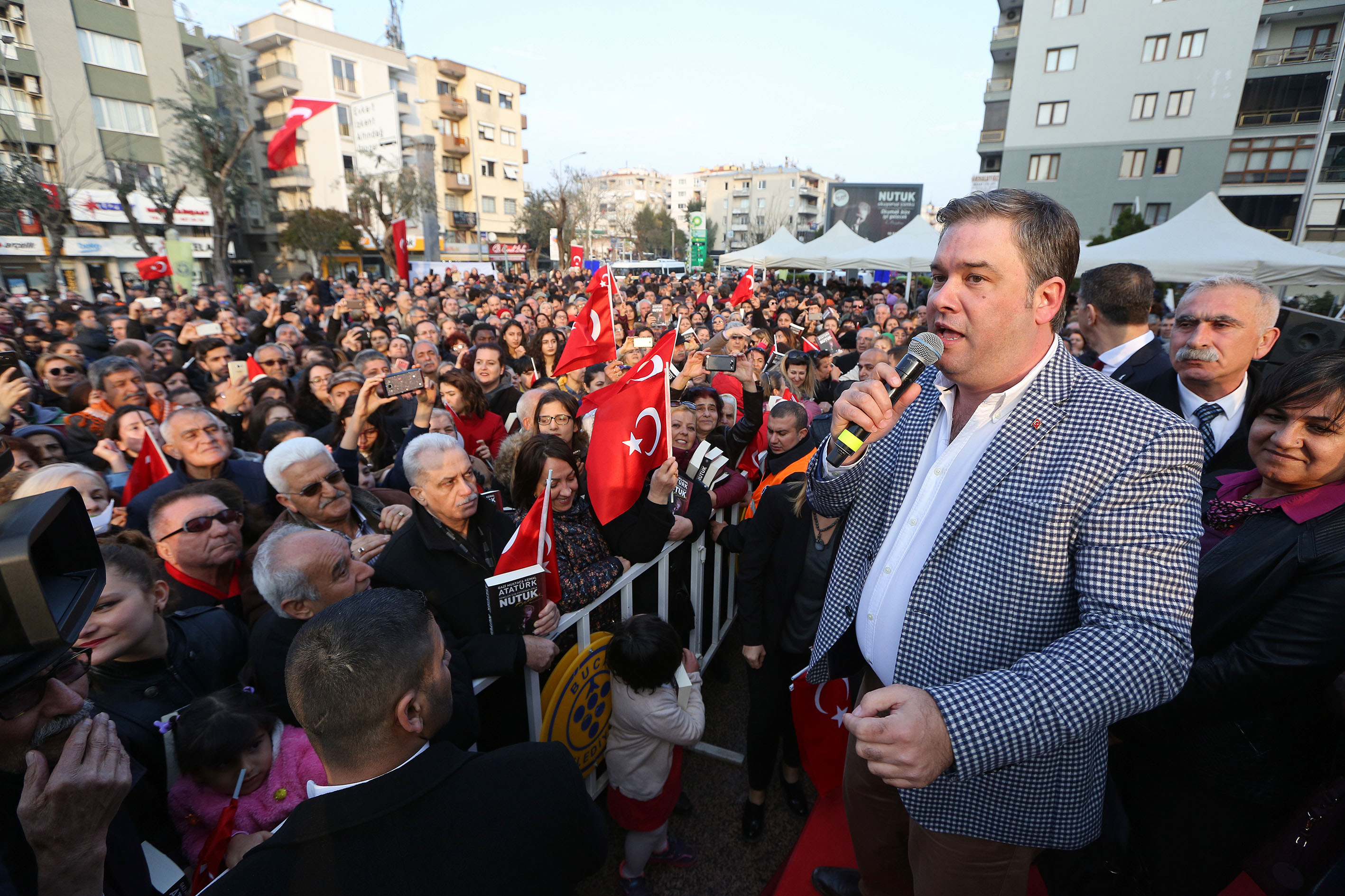 Alanda toplanan binlerce vatandaşa seslenen Buca Belediye Başkanı Levent Piriştina, bu ülkenin değerlerine olan sadakatin ve kararlığımızı vurgulamak için, geçmiş tarihte bu ülke için mücadele edenleri anlatan Atamızın en değerli ve kıymetli eserlerinden biri olan, bir mücadelenin özetini dağıtmaktan gurur duyduklarını söyledi. Nutuk’un asla bir siyasi belge olmadığını vurgulayan Başkan Piriştina, “Bu ülkenin nasıl kazanıldığını, ne tür fedakarlıklar yapıldığını, nasıl bedeller ödendiğini anlatan bu eseri dağıtma kararını aldığımızda ve onu dağıtmak üzere yaptığımız çağrıda bizi yalnız bırakmayan, sizlerin önünde saygıyla eğiliyorum. İyi ki varsınız! Sizleri burada görmek zamanında verilen mücadelenin ne kadar haklı olduğunu ve asla bu mücadeleyi kaybetmeyeceğimizi bize bir kez daha gösterdi. Tüm hemşerilerime sonsuz teşekkür ediyorum. Buca hep ilklere imza attı. Bu kampanyada bu etkinlikte coşkusuyla bir ilk olsun. Bundan sonra tüm Türkiye’ye yayılsın istiyoruz. O enerjiyi o havayı burada koklamamak mümkün değil. Kampanyanın simgesi haline gelen İsmail Küçükkaya’ya sizlerin önünde teşekkür ediyorum” diye konuştu.