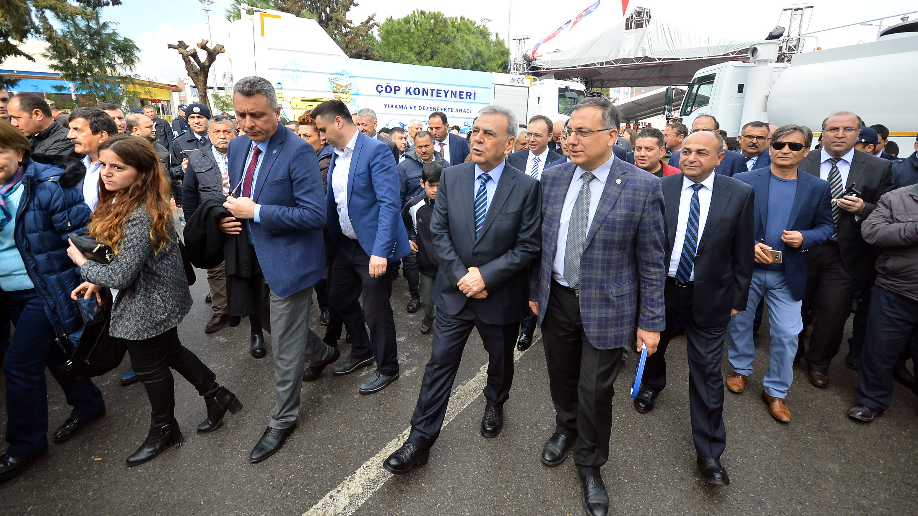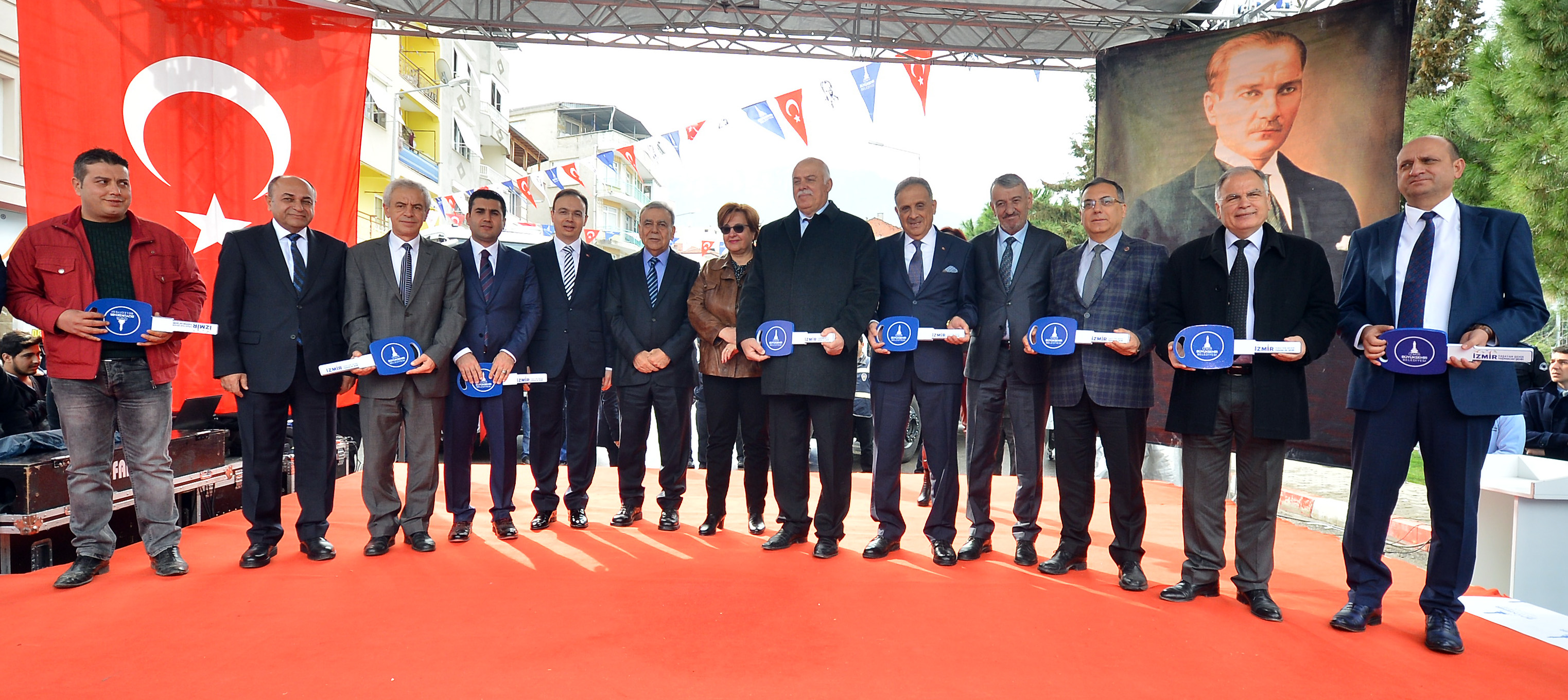 Konuşmaların ardından, Tire Belediye Başkanı Tayfur Çiçek, Bayındır Belediye Başkanı Ufuk Sesli, Kemalpaşa Belediye Başkanı Arif Uğurlu, Selçuk Belediye Başkanı Zeynel Bakıcı, Beydağ Belediye Başkanı Vasfi Şentürk, , Ödemiş Belediye Başkanı Mahmut Badem, Torbalı Başkanvekili Yener Ülker ile Kiraz Belediyesi’nden Ali Turna, temizlik araçlarının anahtarlarını İzmir Büyükşehir Belediye Başkanı Aziz Kocaoğlu’nun elinden aldı. 8 ilçeye çöp konteyneri yıkama, moloz konteyneri taşıma ve vidanjörden oluşa 3’er adet temizlik aracı olmak üzere 24 araç hibe edilecek. Araçlar daha sonra kuzey, yarımada ve merkez bölgede bulunan 22 ilçe belediyesine de teslim edilecek.