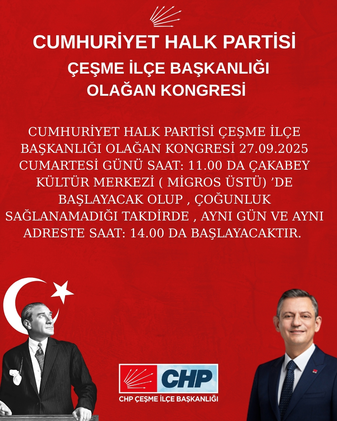 Cumhuriyet Halk Partisi Çeşme İlçe Başkanlığı Kongresi 27.09.2025 Cumartesi günü saat 11.00'de Çeşme Çakabey Kültür Merkezinde (Çeşme Migros üstü) yapılacak.
