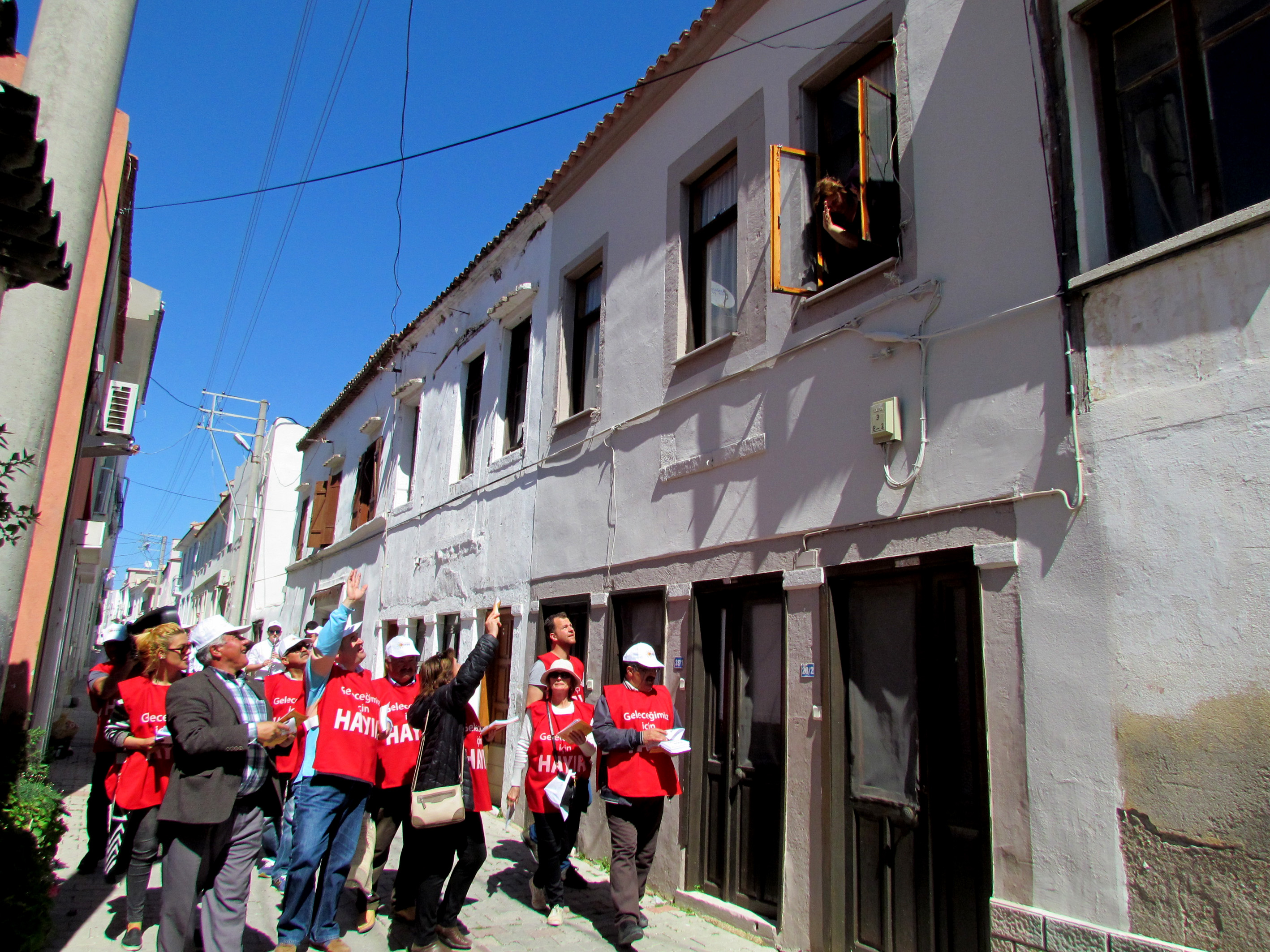 Çeşme'de de, Anayasa değişikliğinin getireceği sakıncaları halka anlatmak için çalışma yürüten, aralarında çok sayıda kadının da olduğu Cumhuriyet gönüllüleri, "Hayır Bandosu" eşliğinde broşürler dağıttılar.