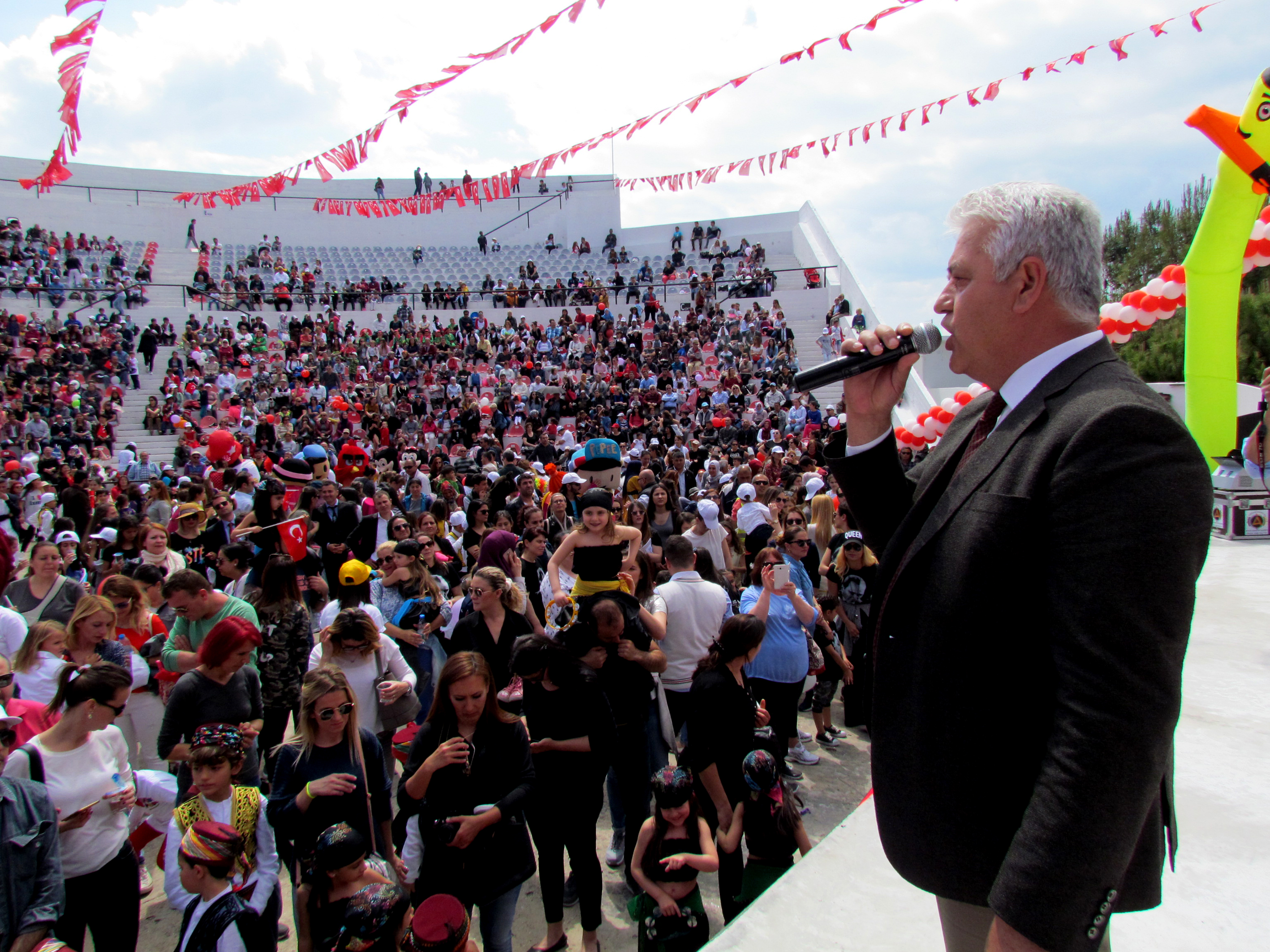 Amfi Tiyatro'ya kadar devam eden kortejin ardından ise törenlerin son bölümüne geçildi. Amfi Tiyatro'yu dolduran çok sayıda vatandaşa ve öğrencilere seslenen Çeşme Belediye Başkanı Muhittin Dalgıç, "Çeşme'nin aydınlık yüzleri, merhaba" diyerek başladığı konuşmasında şöyle dedi; "23 Nisan 1920, Gazi Meclis'in kurulduğu gündür. Büyük devlet adamı Gazi Mustafa Kemal Atatürk, dünyada hiç kimsenin düşünmediği bir şeyi gerçekleştirerek, bu önemli günü çocuklara bayram olarak hediye etti. O nedenle 23 Nisan'ı büyük bir coşkuyla kutlamalıyız. Görüyorum ki, Çeşmemizin aydınlık insanları ve genç kuşağımız, bu önemli günü büyük bir coşkuyla kutluyor. 23 Nisan Ulusal Egemenlik ve Çocuk Bayramımız hepimize kutlu olsun."