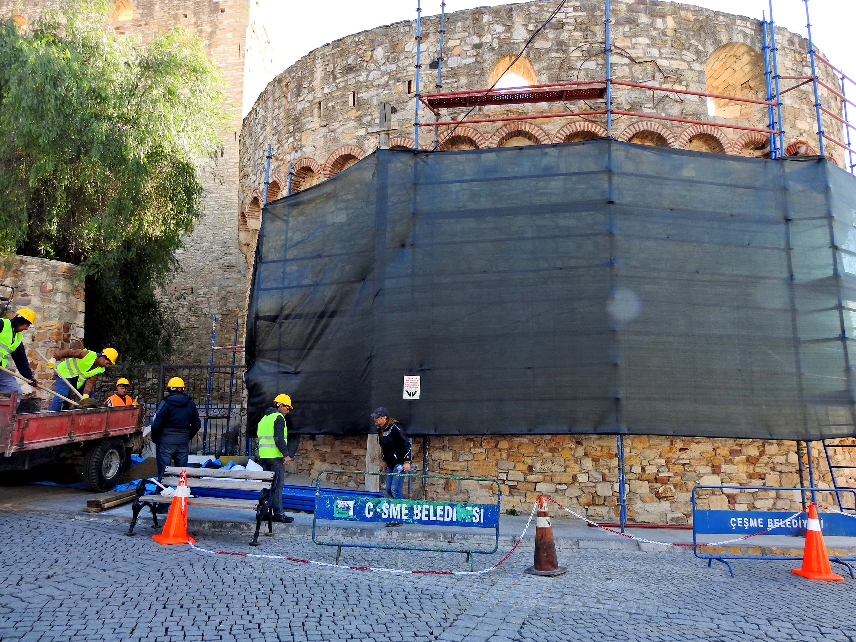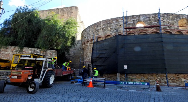 Bir süredir taş dökülmelerinin yaşandığı Çeşme Kalesi'ndeki Ceneviz Kulesi'nin restorasyonuna başlandı.
