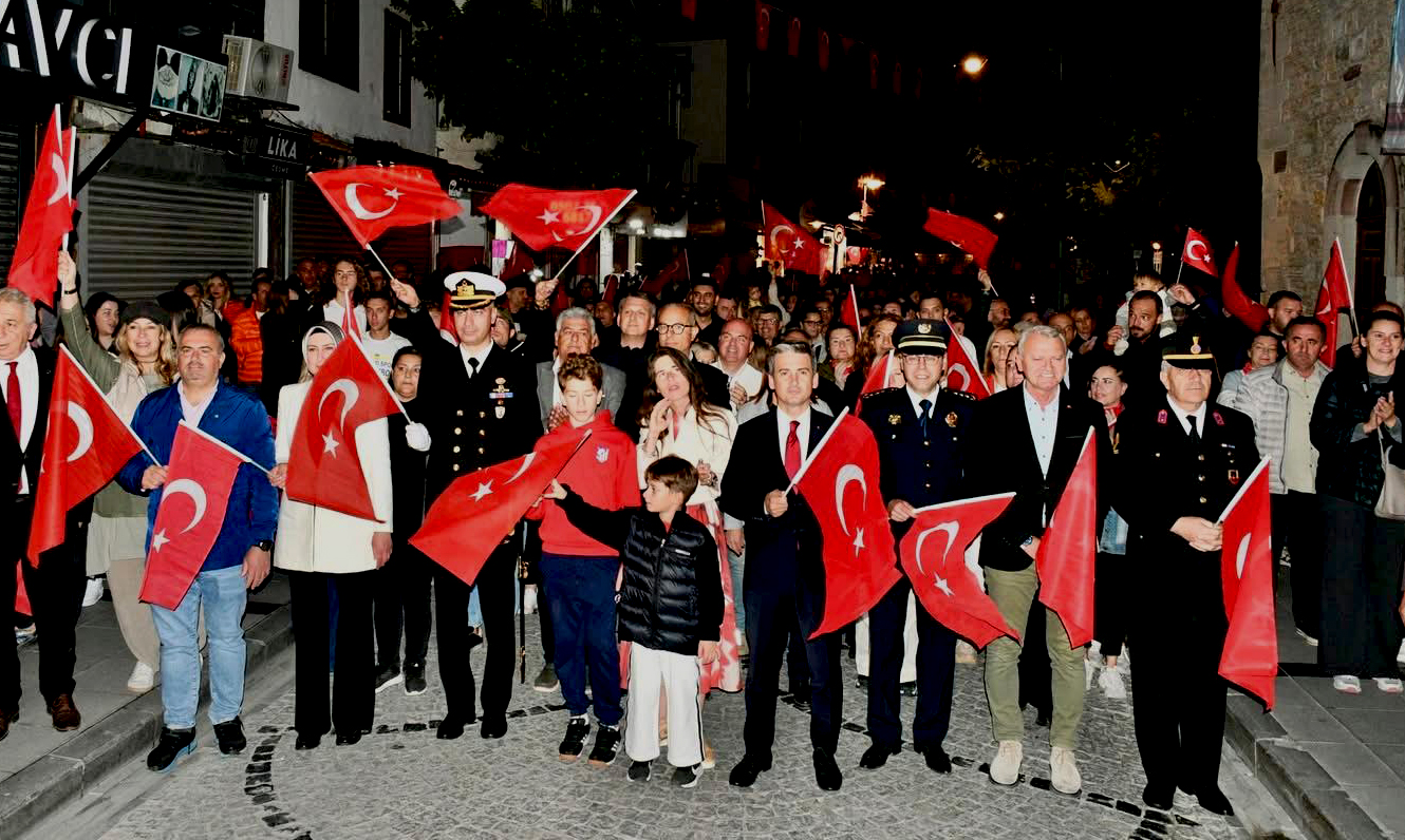 Binlerce Çeşmeli vatandaş, ellerinde Türk bayrakları ve meşalelerle Uğur Mumcu Parkı’ndan Cumhuriyet Meydanı’na yürüdü. Yürüyüşe Çeşme Kaymakamı Mehmet Marşlı, Çeşme Belediye Başkanı Lal Denizli, ilçe protokolü, belediye başkan yardımcıları, meclis üyeleri, siyasi parti ve sivil toplum kuruluşu temsilcileri, kurum ve kuruluş amirleri, mahalle muhtarları ile çok sayıda vatandaş katıldı.
