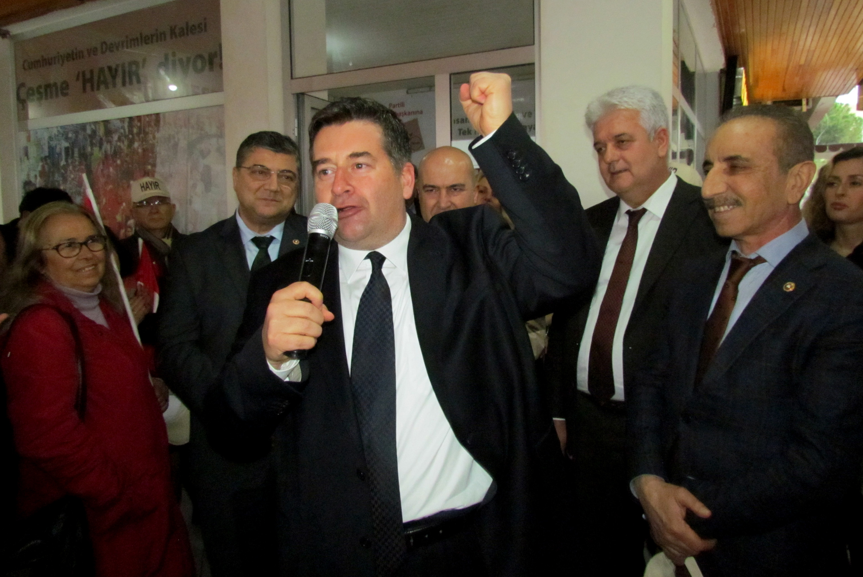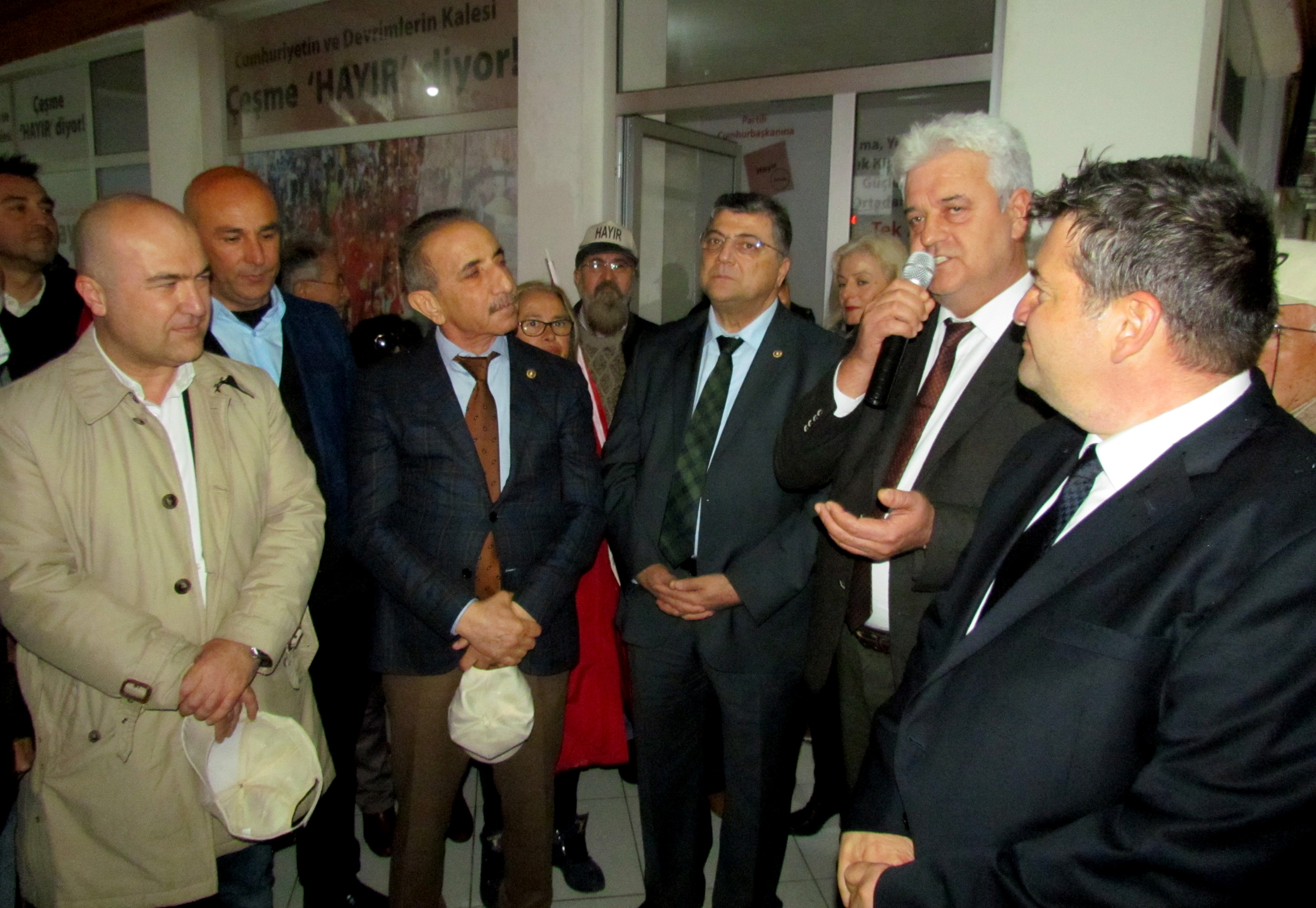 Çeşme Belediye Başkanı Muhittin Dalgıç, açılışta yaptığı konuşmada, "Bu bir siyasal olgu değil. Bu, memleketin geleceği ile ilgili, çocuklarımız için, torunlarımız için yapmak istediğimiz bir tercihtir. Bu tercihle, tek adamlığa, hukukun üstünlüğünü yok sayanlara, meclisin yetkilerini elinden alanlara 'Hayır' demek için hepimize çok büyük görev düşüyor. Onun için, her saniyemizi, bir arkadaşımıza bunu anlatmakla geçirmeliyiz. Ama şunu da ifade edeyim; Çeşme'nin aydınlık insanları, o aydınlık düşünceleri ile birlikte, sandıkta, yüzde 75'ler civarında 'Hayır' çıkararak, Türkiye'ye aydınlık yüzünü gösterecektir" diye konuştu.