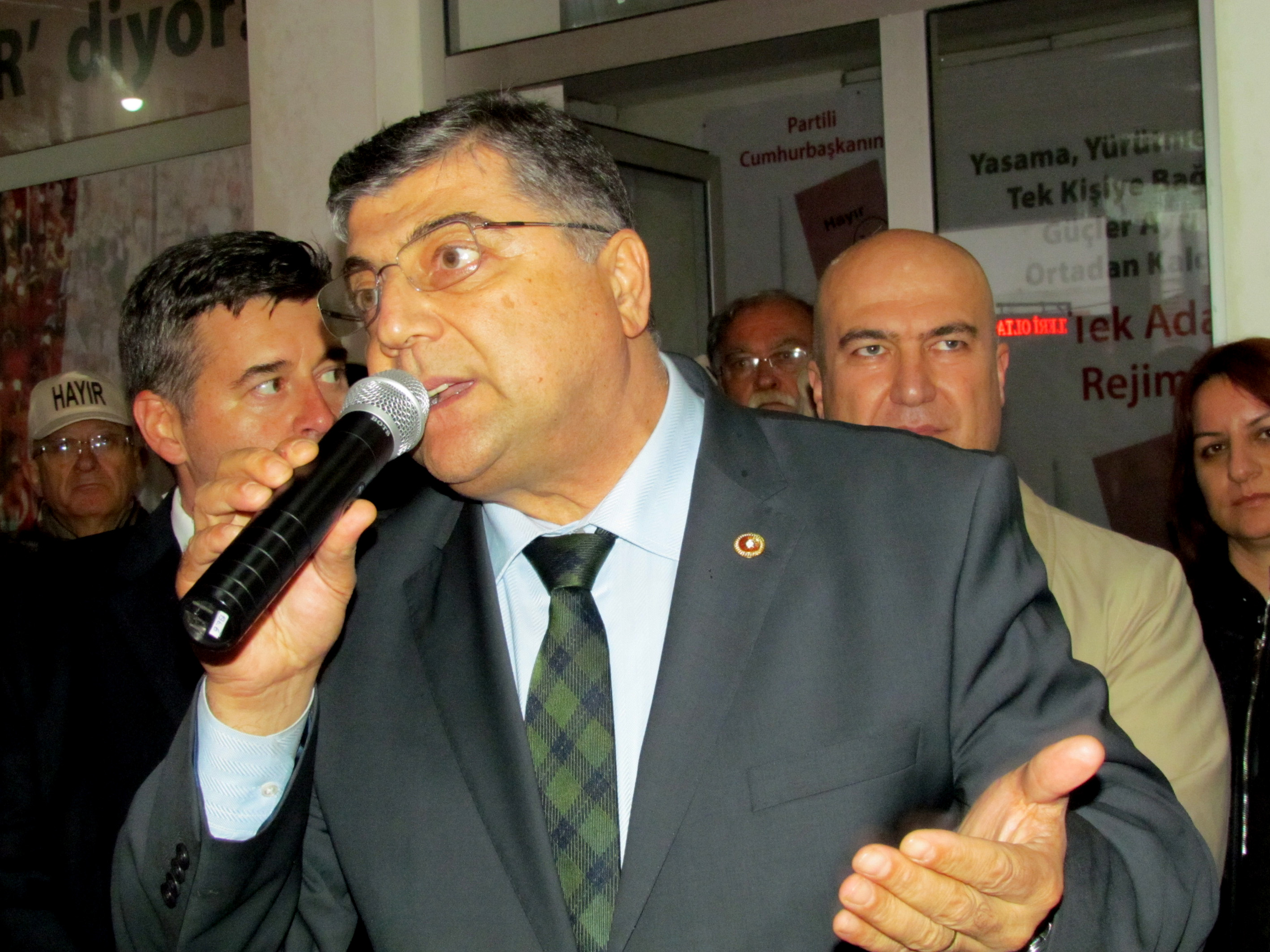 Açılışta CHP İzmir Milletvekili Ali Yiğit de bir konuşma yaparak, "İki ay öncesine kadar, bu ülkede demokrasi nasıl olacak, bireyin özgürlüğü nasıl olacak, yargıyı nasıl bağımsız kılacağız diye uğraşırken, bugün rejimi tartışır olduk. Şu an tartışılan, ülkenin geleceği. Ülkenin geleceği oylanacak. Bizler CHP'ye oy istemiyoruz. Ülkenin geleceğine oy istiyoruz. Dün, saraydan alınıp, halka verilen, bugün tekrar halktan alınıp saraya verilmeye çalışılıyor. Yargı bağımsızlığı yoktu. Daha da beter oluyor. Kendisi de bir gün kazara yargılanacak olursa, onun da tiyosunu alırsa, hemen o gece kalkacak, onların görevlerine son verecek. Devleti yeni baştan istediği gibi oluşturacak" diye konuştu.