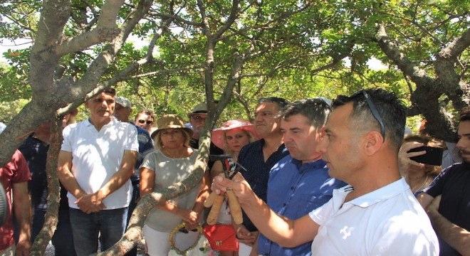 Oran’ın konuşmasının ardından tüm katılımcılar sakız ağaçlarının altına davet edildi. Katılımcıların yoğun ilgi gösterdiği etkinlikte sakız ağacı ve hasadı konusunda uzmanlar tarafından bilgilendirme yapıldı. Belediye Başkanı Ekrem Oran’ın sakız ağaçlarına attığı ilk çiziklerin ardından sakız ağacı hasat işlemleri başlatıldı.