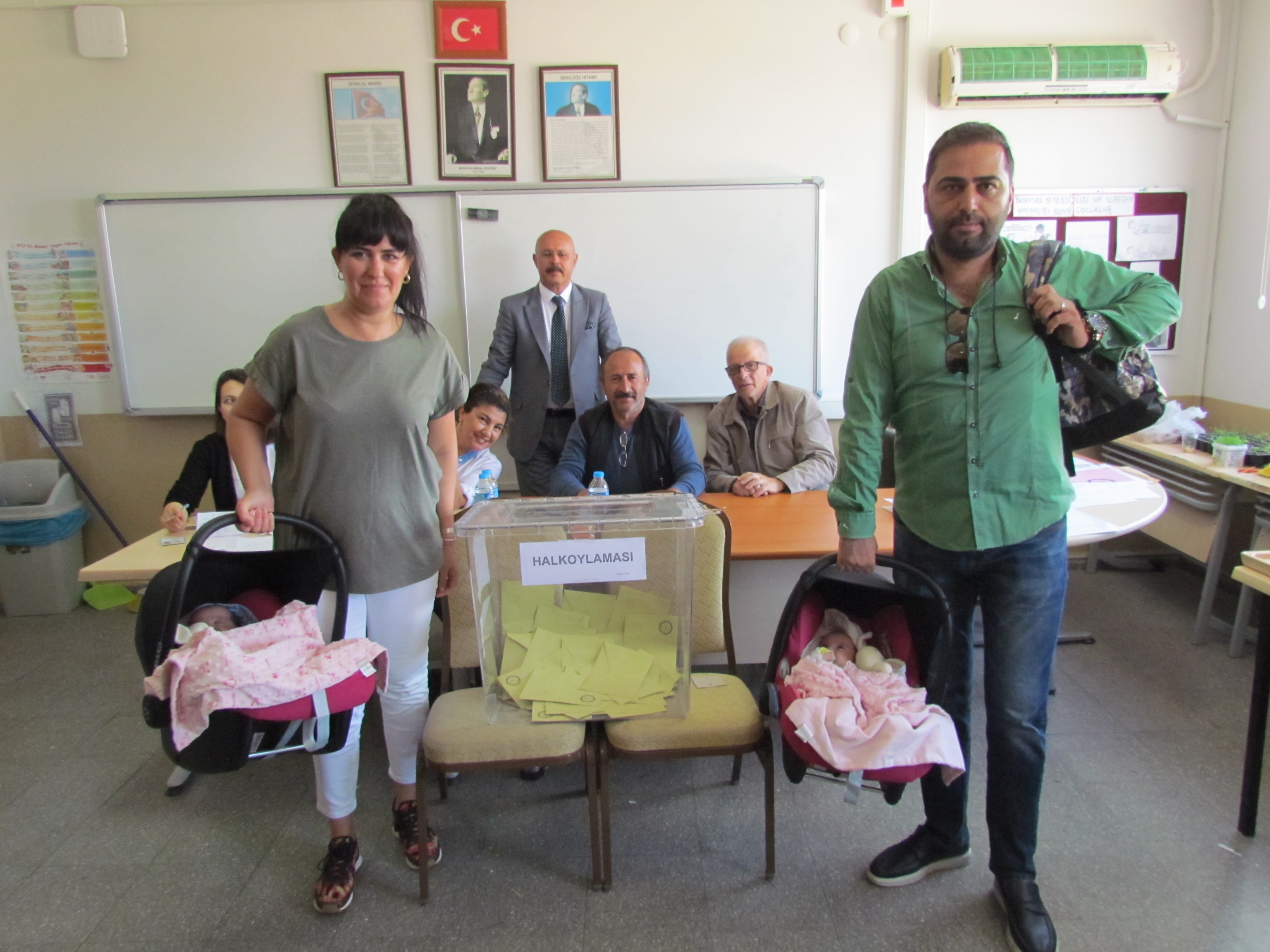 Öte yandan bir aylık ikiz çocuklarını koydukları puşetlerle oy kullanmaya gelen bir çift de ilgi odağı oldu.
