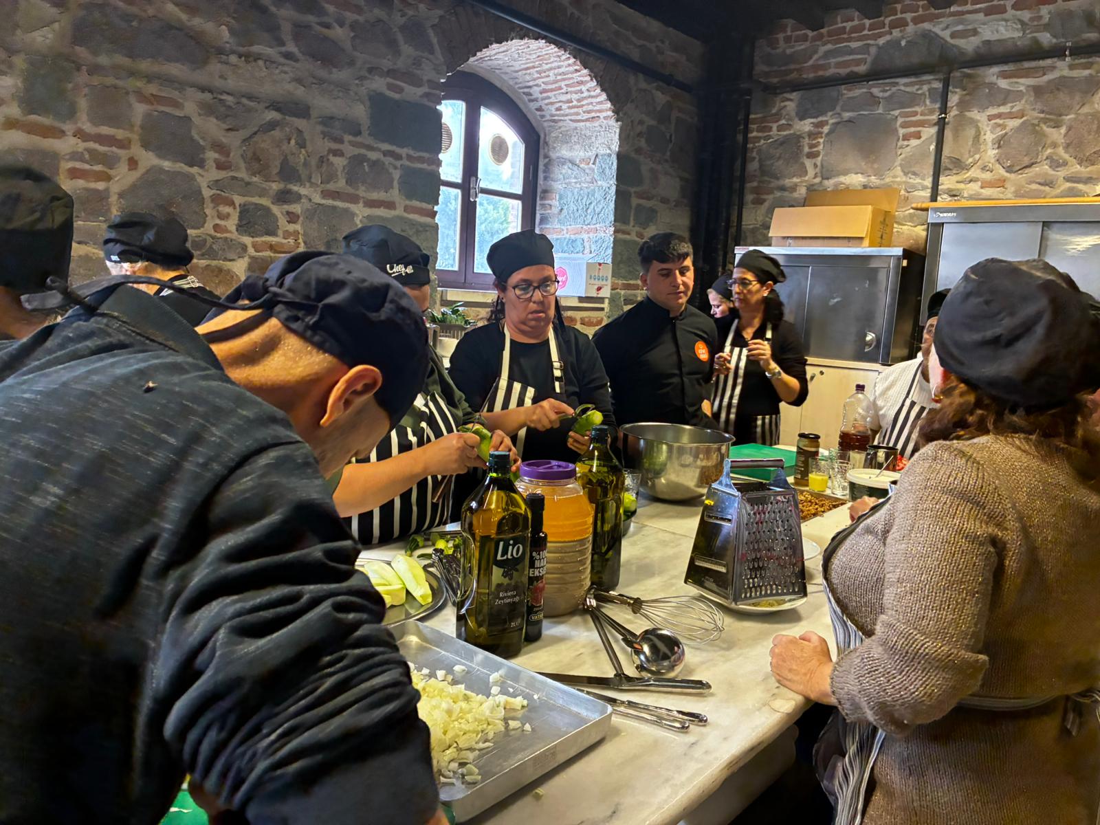 İzmir Büyükşehir Belediyesi’nin Meslek Fabrikası’nda düzenlediği sağır ve işitme engelli kursiyerlere yönelik pastacı çıraklığı kursundan mezun olan kursiyerler, İzmir Çeşme’de restoranı bulunan ve sosyal medya platformlarında birbirinden özel tariflerini paylaşan şef Rıfat Yurttaş ile buluştu. Engelli Çalışmaları Şube Müdürlüğü’nde görevli işaret dili çevirmenleri Özlem Özer ve Melek Uslular’ın çevirmenliğiyle katılımcılarla iletişim kuran Yurttaş, onlarla birlikte Ege mutfağına ait meze ve zeytinyağlı yemekler yaptı.