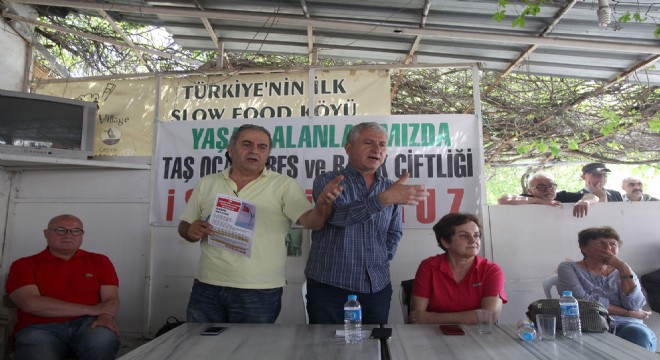 Toplantıda söz alan CHP Çeşme İlçe Başkanı Ekrem Oran, CHP olarak halkın sağlığını, çevrenin korunmasını önemsediklerini vurgulayarak, "Halk sağlığına ve çevreye zarar verecek her şeyin karşısındayız. Biz nasıl şeker fabrikalarının satılmasına karşıysak, biz nasıl seçimlere hile karıştırılmasına karşıysak, biz nasıl kadınlarımızın iffetinin kahkahasıyla yargılanmasına, çocuklarımızın tarikat yuvalarında tecavüzlere uğrayarak, geleceklerinin engellenmesine karşıysak, biz nasıl milli eğitimimizin gayri milli yapılmasına karşıysak, biz CHP olarak Ildır'da orkinos balıkları çiftliklerinin denizimizi kirletmesine karşıysak, biz Ovacık'ta RES'lerin, Germiyan'da taş ocaklarının karşısında yer aldık. Şu anda OHAL dönemini üzülerek yaşıyoruz. Bu ülke eğer KHK'larla yönetiliyorsa, taş ocakları da, RES sorunu da, balık çiftlikleri de bir KHK'ya bakar. AKP'li arkadaşlarımız bugün buradaysa, Çeşme'ye destek vermek üzere buradalar. O zaman hodri meydan; hükümetleri ile konuşsunlar, Çeşme'deki RES'lerle, balık çiftlikleri ve taş ocakları ile ilgili olarak hükümetleri KHK çıkarsın ve bu iş bitsin" diyerek çağrıda bulundu.