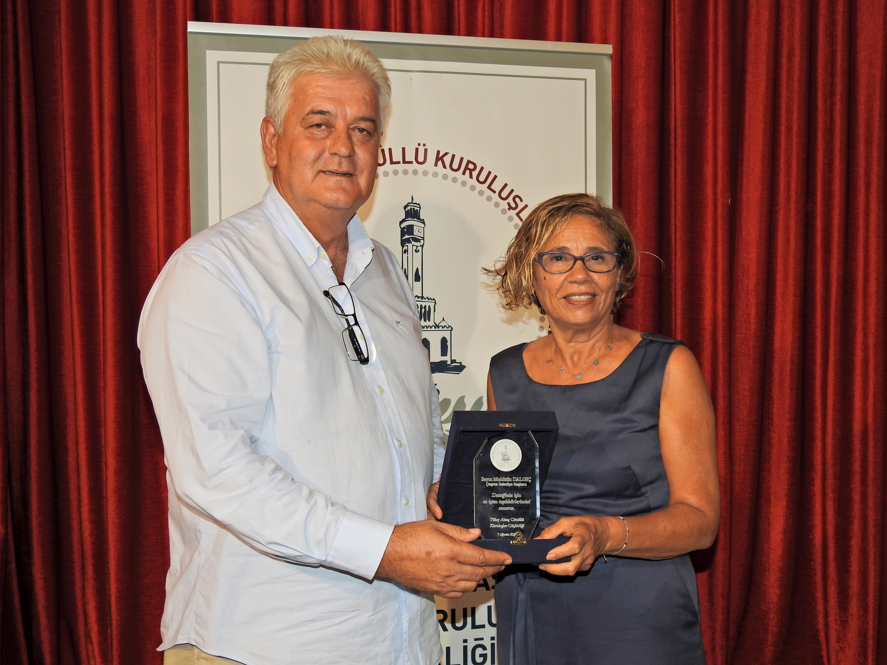 İzmir Tülay Aktaş Gönüllü Kuruluşlar Güçbirliği Başkanı Fatoş Dayıoğlu, toplantıya olan katkılarından dolayı Çeşme Belediye Başkanı Muhittin Dalgıç'a bir plaket verdi.