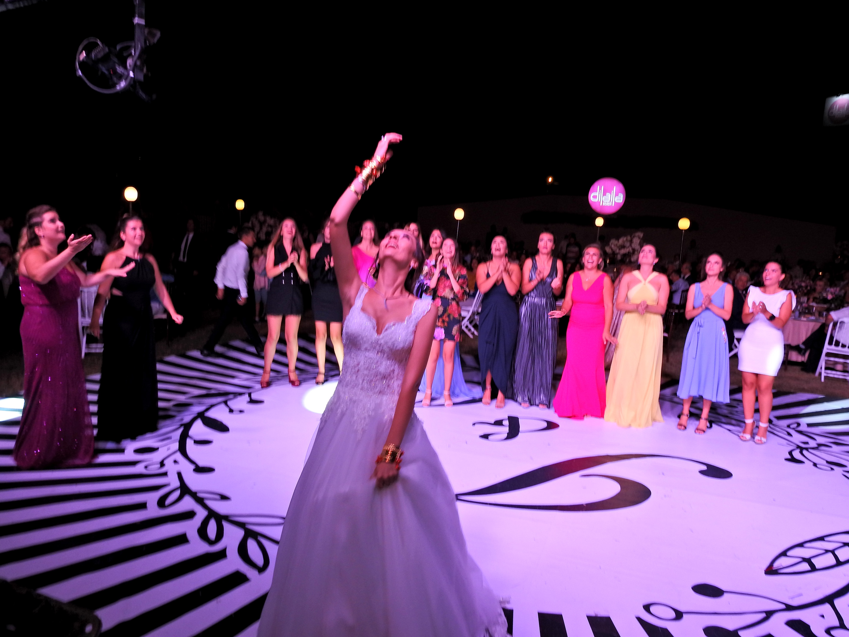 İzel ve Onur Dalgıç çiftinin düğün pastasını kesmesinin ardından, genç gelin, pistte toplanan arkadaşlarına gelin çiçeğini attı.