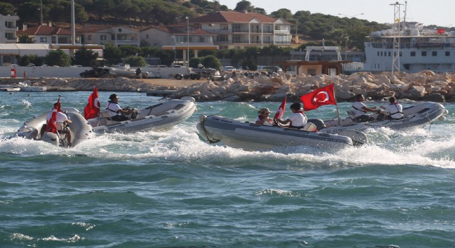 IC Çeşme Marina’ya bağlı botlar, geçit töreni yaparak gösterilere renk katarken Ulusoy Liman İşletmesine bağlı römorkör de bu gösterilere eşlik etti.