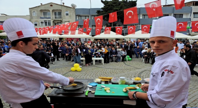 Açılış konuşmalarının ardından, Çeşme Belediye Başkanı Muhittin Dalgıç ve İlçe Milli Eğitim Müdürü Bahattin Gengörü, sahneye kurulan seyyar mutfakta, alevli tava ile yarışmayı başlattılar.