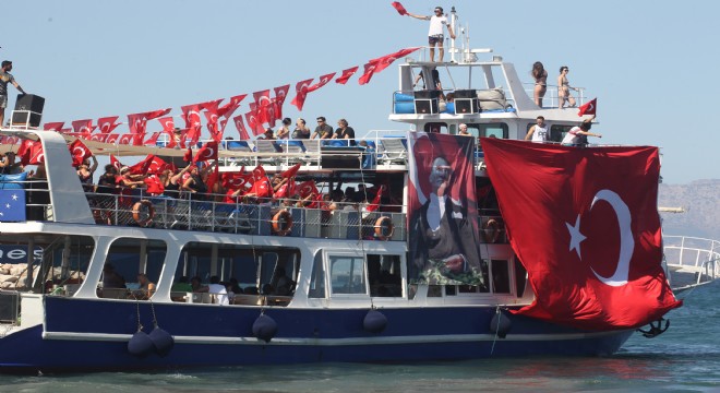 Müşterilerine Atatürk resimli T-Shirt dağıtarak farkındalık yaratan tur şirketleri, teknelerini de özel olarak hazırlattıkları Türk Bayrakları ile donatarak denize açıldılar.