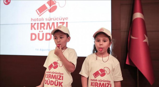 Trafik güvenliğine ilişkin hazırlanan kamu spotlarının izletildiği toplantıda, sahnede bulunan iki çocuk, kırmızı düdüklerini çalarak kampanyayı başlattı.