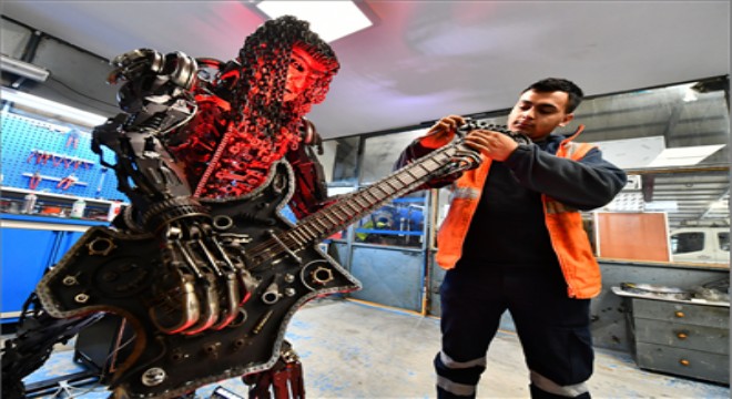 Makine ve araçlardan çıkan atık malzemelerden heykel yaparak yaratıcılığın sınırlarını zorlayan Büyükşehir Belediyesi teknikerleri, deve kuşundan yusufçuğa, gitardan baykuşa kadar gerçekleştirdikleri çalışmalara şimdi "ustalık dönemi" eserini de ekledi: Gitar çalan rockçı..