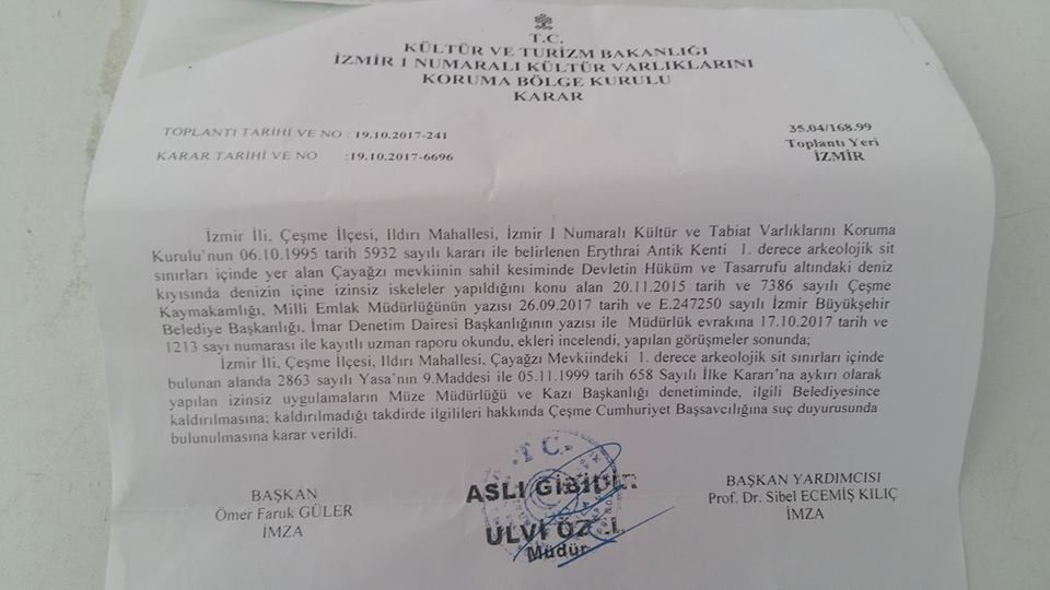 "İzmir İli,Çeşme İlçesi Ildır Mahallesi, İzmir 1 Numaralı Kültür ve Tabiat Varlıklarını Koruma Kurulu'nun 06.10.1995 tarih, 5932 sayılı kararı ile belirlenen Erythrai Antik Kenti 1. derece arkeolojik sit sınırları içerisinde yer alan Çayağzı mevkiinin sahil kesiminde, devletin hüküm ver tasarrufu altındaki deniz kıyısında, denizin içine izinsiz iskeleler yapıldığını konu alan 20.11.2015 tarih ve 7386 sayılı Çeşme Kaymakamlığı, Milli Emlak Müdürlüğü'nün yazısı, 26.09.2017 tarih ve E247250 sayılı sayılı İzmir Büyükşehir Başkanlığı, İmar Denetim Dairesi Başkanlığı'nın yazısı ile Müdürlük evrakına 17.10.2017 tarih ve 1213 sayı numarası ile kayıtlı uzman raporu okundu, ekleri incelendi. Yapılan görüşmeler sonunda;