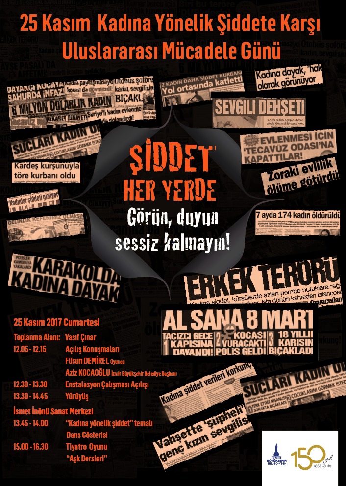 İzmir Büyükşehir Belediyesi, "25 Kasım Kadına Yönelik Şiddete Karşı Uluslararası Mücadele Günü " kapsamında birbirinden renkli etkinliklere imza atacak. Cumartesi günü gerçekleştirilecek program saat 12.00'de Alsancak Vasıf Çınar Meydanı'ndaki açılış konuşmaları ve çeşitli gösterilerle başlayacak. Burcu Bostancıoğlu tarafından gerçekleştirilen enstalasyon çalışmasında ise şiddete maruz kalarak yaşamını yitirmiş kadınları sembolize eden beyaz güller ve şiddeti simgeleyen kırmızı su ile dolu şırıngalar yer alacak. Bu objeler, katledilen kadınları temsilen hazırlanmış kelebek figürü üzerine yerleştirilecek. Aralarında İzmir Büyükşehir Belediye Başkanı Aziz Kocaoğlu ve sanatçı Füsun Demirel'in de yer aldığı katılımcılar, daha sonra Kültürpark İsmet İnönü Sanat Merkezi'ne kadar yürüyecek. Burada yine Büyükşehir Belediyesi tarafından düzenlenen kadına yönelik şiddet temalı dans gösterisi ve "Aşk Dersleri" adlı tiyatro oyunu sahnelenecek.