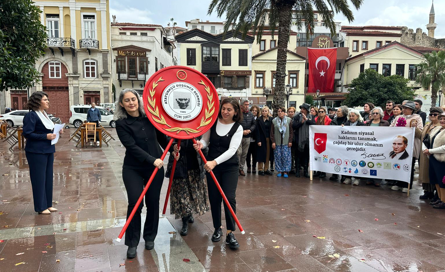 Açıklama öncesinde, sivil toplum kuruluşları adına Atatürkçü Düşünce Derneği (ADD) Çeşme Şubesi, Cumhuriyet Meydanı’ndaki Atatürk Anıtı’na çelenk bıraktı.