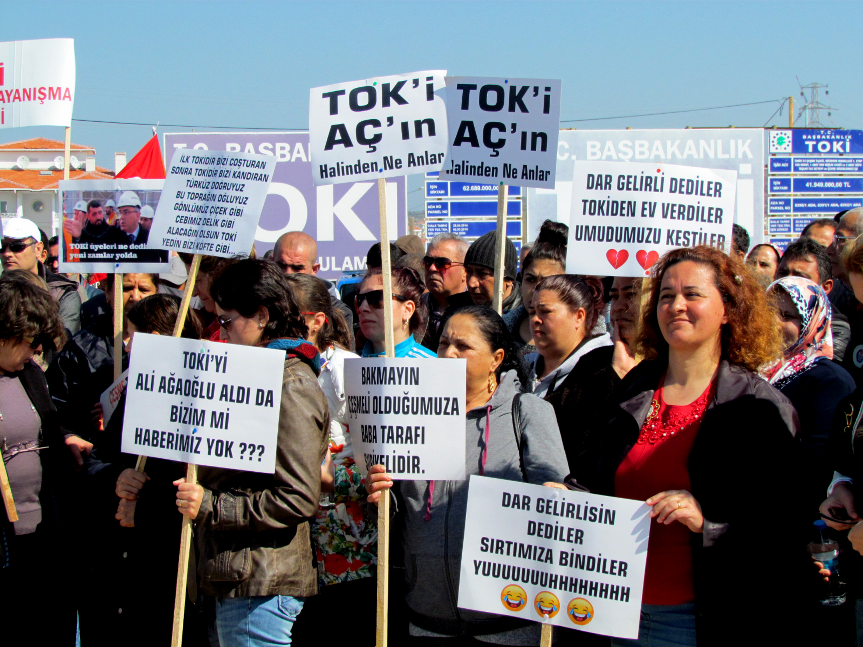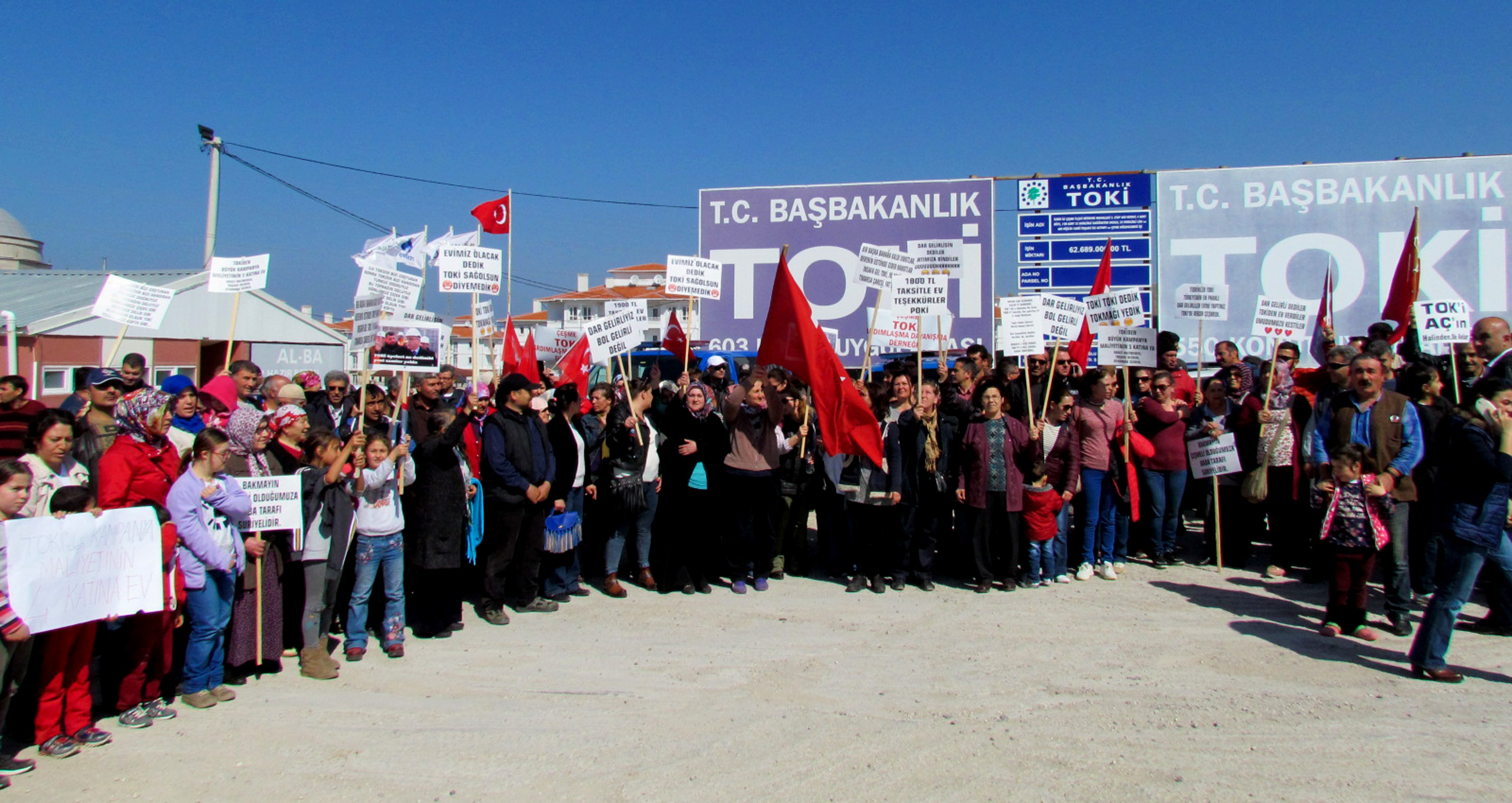 Hak sahipleri adına hazırlanan basın bildirisinde, projenin dar gelirli, ihtiyaç sahibi insanları ev sahibi yapmak için uygulandığına dikkat çekilerek, "TOKİ'nin Türkiye genelinde yapmış olduğu projelerle, yüzbinlerce insan hakettiği yuvalarına kavuşmuştur. Bizlerin yaşadığı sorunlar, başka hiçbir TOKİ projesinde yaşanmamıştır. Anayasal hakkımız olan barınma hakkımıza, devletin yapmış olduğu TOKİ evleri sayesinde kavuşma imkanına sahip olduğumuz anda, gözünü kazanç hırsı bürümüş, paralı insanların bu hakkı elimizden almaya çalışması büyük haksızlıktır. Bizler, Çeşme'de dar gelirli olarak yaşayan ve gelirinin yarısını kiralara ödeyerek, zar zor geçinmeye çalışan vatandaşlar olarak Çeşme nüfusunun yüzde 70'ini oluşturmaktayız. Bizler, hayallerimize kavuşmaya bu kadar yaklaşmışken, bize sunulan yüzde 100 zamlı fiyatların altından kalkmamız mümkün değildir. Çoğu dar gelirli olan vatandaşların başlangıç olarak bin 800 liralara varan rakamları ödemeleri mümkün değildir. Bin 27 konut olarak yapılan bu projenin dar gelirli ve ihtiyaç sahibi vatandaşa teslim edilmemesi halinde yaklaşık 10 bin kişiyi olumsuz etkiler" denildi.