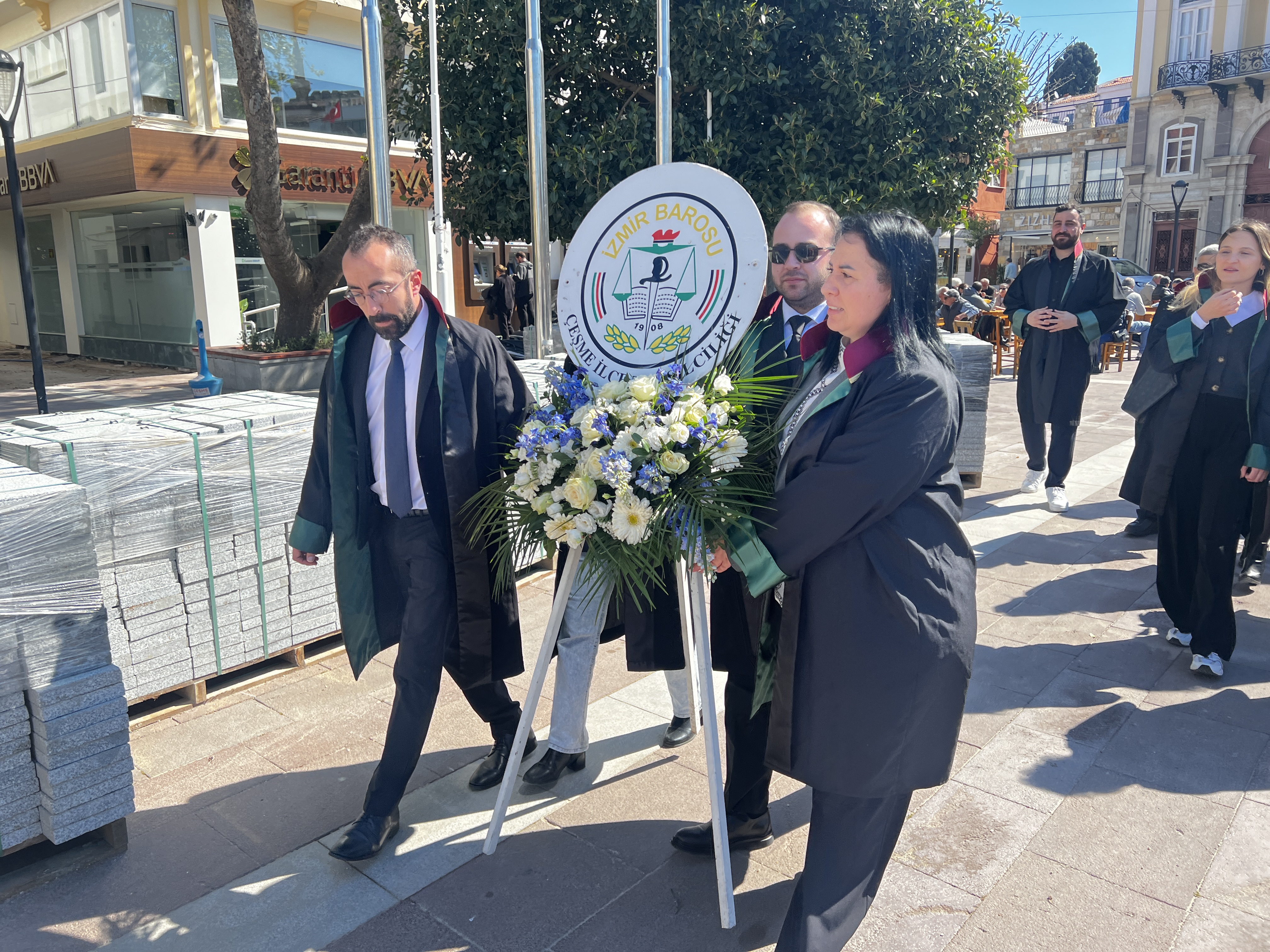 Kutlama programı, İzmir Barosu Çeşme Temsilciliği üyesi avukatların Çeşme Cumhuriyet Meydanı’ndaki Atatürk Anıtı’na çelenk sunmasıyla başladı. Gazi Mustafa Kemal Atatürk ve silah arkadaşları anısına yapılan saygı duruşunun ardından İstiklal Marşı cep telefonundan çalınarak hep bir ağızdan okundu.