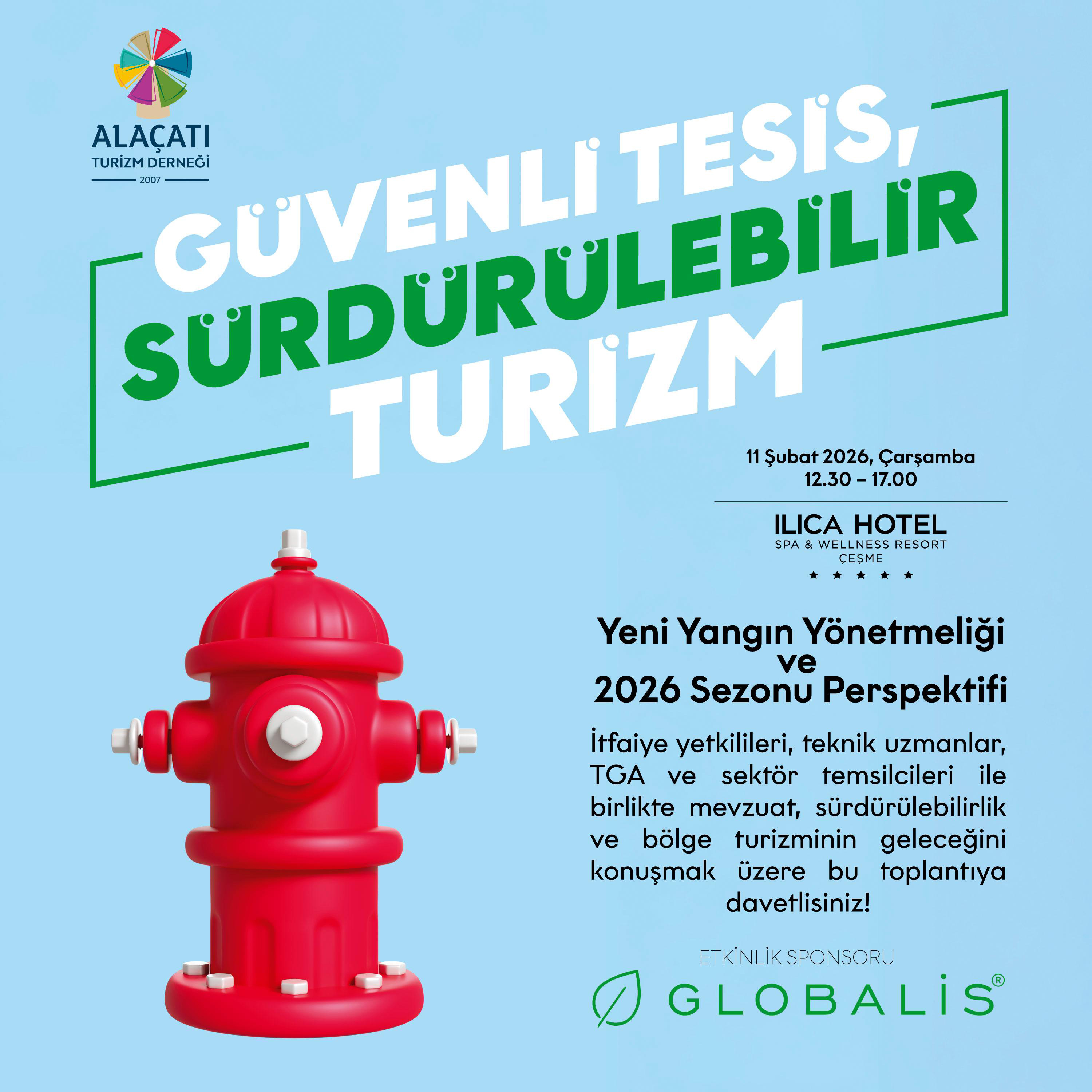Alaçatı Turizm Derneği öncülüğünde gerçekleştirilecek “Güvenli Tesis, Sürdürülebilir Turizm – Yeni Yangın Yönetmeliği ve 2026 Sezonu Perspektifi” başlıklı toplantı, 11 Şubat 2026 tarihinde Çeşme Ilıca Otel’de yapılacak.